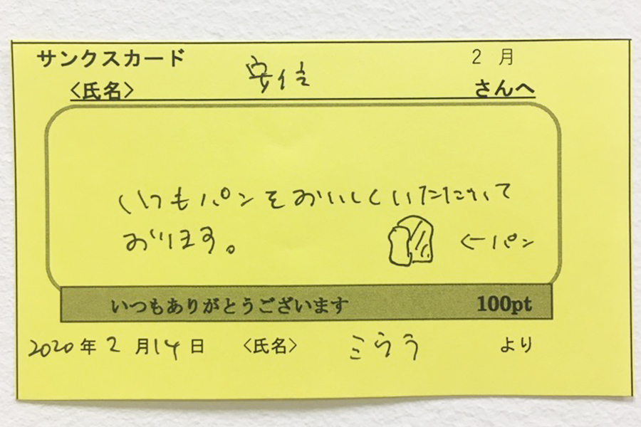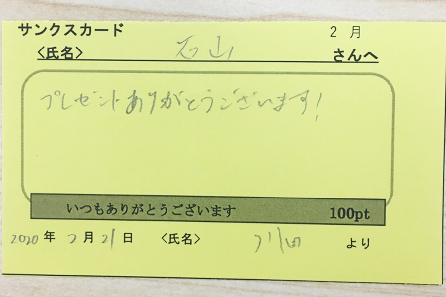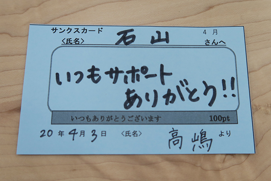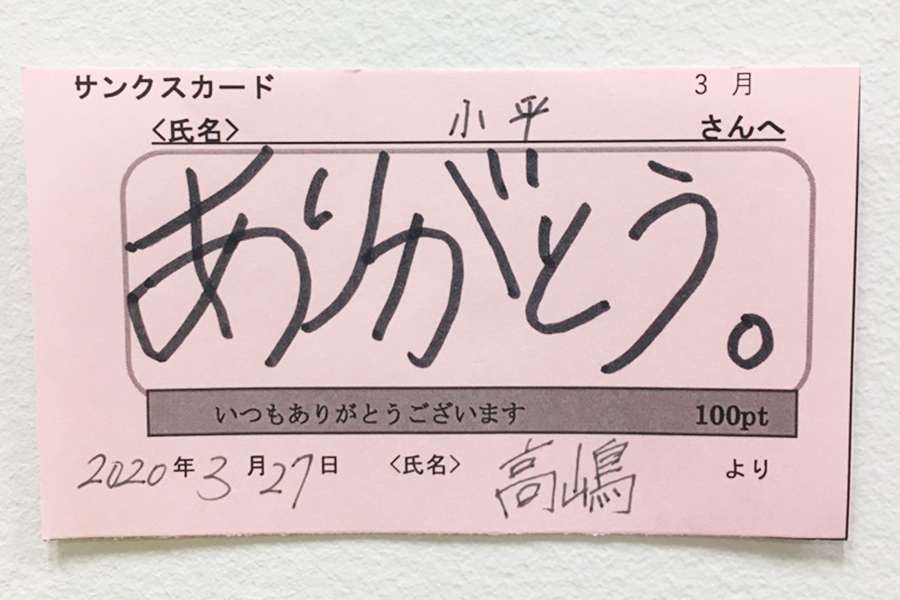 毎月社員一人一人に30枚支給され、社員は「感謝」を